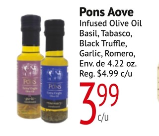 Pons Aove Infused Olive Oil Basil, Tabasco, Black Truffle, Garlic, Romero, Env. de 4.22 oz.