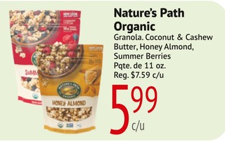 Nature's Path Organic Granola. Coconut & Cashew, Butter, Honey Almond Summer Berries Pqte. de 11 oz. Reg. $7.59 c/u