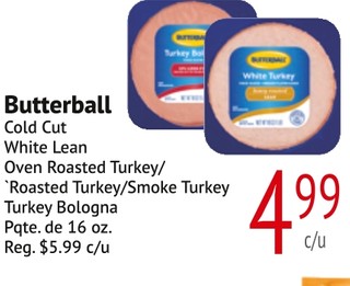 Butterball cold cut white lean oven roasted turkey/ roasted turkey/ smoke turkey turkey bologna pqte. de 16 oz.