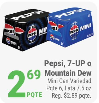 Pepsi, 7-UP o Mountain Dew E Mini Can Variedad Pqte 6, Lata 7.5 oz