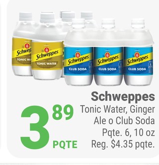 Schweppes tonic water, ginger ale o club soda pqte. 6, 10 oz