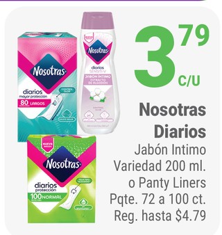 Nosotras diarios jabon intimo 200 ml. o panty liners pqte. 72 a 100 ct.