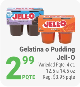Gelatinas o Pudding Jell-O Variedad Pqte. 4 ct. 12.5 a 14.5 oz
