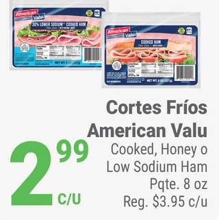 Cortes Frios American Valu Cooked, Honey o Low Sodium Ham Pqte. 8 oz.