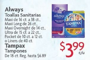 always toallas sanitarias maxi ct.. long overnight ct., ultra pocket liners tampax tampones reg. $alway