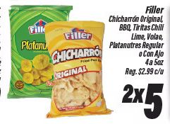filler fill platanu original chicharro chicharrĂ³n bbq, tiritas chili platanutres regular lime, volao, $c/u