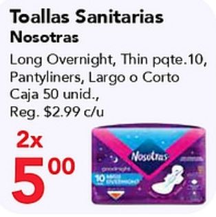 toallas sanitarias long overnight thin pqte pantyliners, corto caja unid., reg. $c/u