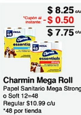 cupon al-$instante: essentia chernia essentials charmin mega roll papel sanitario strong soft =regular $c/u *por tienda