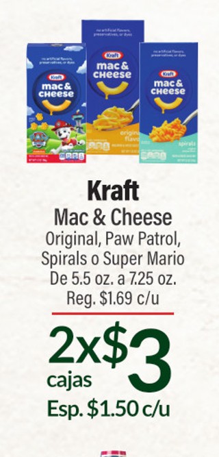 Kraft mac y cheese original, paw patrol, spirals o super mario de 5.5 oz. a 7.25 oz.
