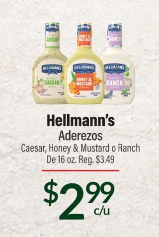 Hellmann´s aderezos caesar, honey y mustard o ranch de 16 oz.