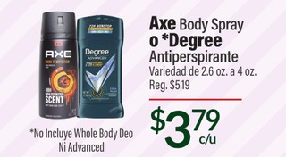 Axe Body Spray o *Degree Antiperspirante Variedad de 2.6 oz. a 4 oz.