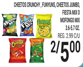 CHEETOS CRUNCHY, FUNYUNS, CHEETOS JUMBO, FISTA MIX O MOFONGO MIX 3.6-5.7 OZ.