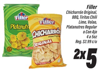 Filler Chicharron Original, BBQ, Tiritas Chili Lime, Volao, Platanutres Regular o Con Ajo 4 a 5oz