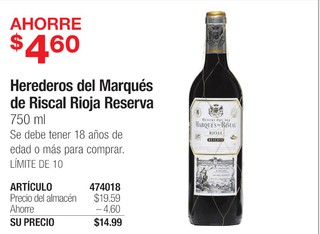 Herederos del Marqués de Riscal Rioja Reserva 750 ml Se debe tener 18 años de edad o más para comprar. LÃMITE DE 10