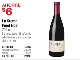 La Crema Pinot Noir 750 ml Se debe tener 18 años de edad o más para comprar. LÃMITE DE 10