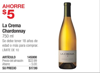 La Crema Chardonnay 750 ml Se debe tener 18 años de edad o más para comprar. LIMITE DE 10