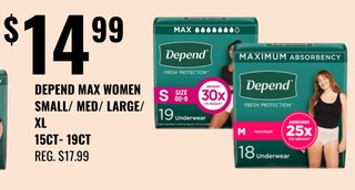 DEPEND MAX WOMEN SMALL/ MED/ LARGE/ XL 15CT-19CT