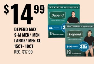 DEPEND MAX S-M MEN/ MEN LARGE/ MEN XL 15CT- 19CT