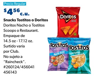 Snacks Tostitos o Doritos Doritos Nacho o Tostitos Scoops o Restaurant. Empaque de 14.5 oz - 17.12 oz.