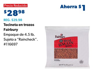 Tocineta en trozos Fairbury Empaque de 4.5 lb. Sujeto a "Raincheck". #116697