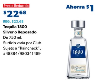 Tequila 1800 Silver o Reposado De 750 ml. Surtido varÃa por Club. Sujeto a "Raincheck". #48884/980341489