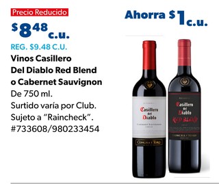 Vinos Casillero Del Diablo Red Blend o Cabernet Sauvignon De 750 ml. Surtido varÃa por Club. Sujeto a "Raincheck". #733608/980233454