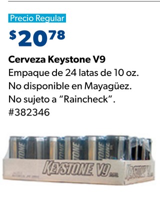 Cerveza keystone v9 empaque de 24 latas de 10 oz. no disponible en mayaguez. no sujeto a ´´raincheck´´. #382346