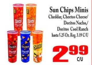 minis conta donto chips cheddar cheetos cheese/ doritos nacho,/ cool ranch reg.