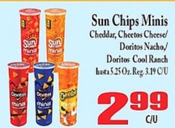 minis contes chips cheddar cheetos cheese/ doritos nacho/ cool ranch reg.