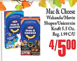 mac& cheese cong wakanda/movie shapes/unicornio kraft reg.