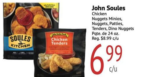 soules chicken tenders kitchen john nuggets minios nuggets, patties, tenders, dino pqte reg. $c/u