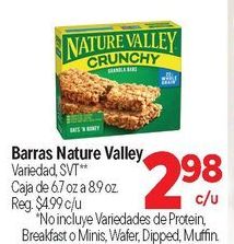 nature valley crunchy barras variedad svt** caja $c/u incluye variedades protein, breakfast minis, wafer, dipped, muffin.