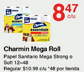 mega essen churnin essentials charmin roll papel sanitario strong soft =regular $c/u *por tienda