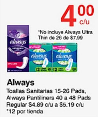 always incluye ultra thin $always toallas sanitarias pads pantiliners regular $c/u *por tienda
