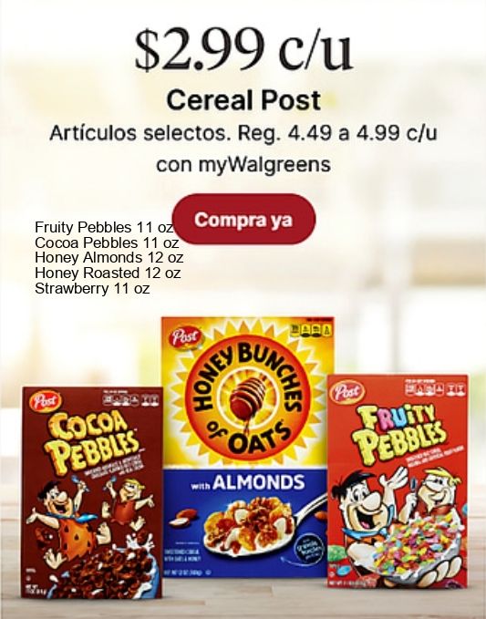$c/u cereal post artÃculos selectos reg. mywalgreens fruity pebbles cocoa honey almonds roasted strawberry compra bunches oats with