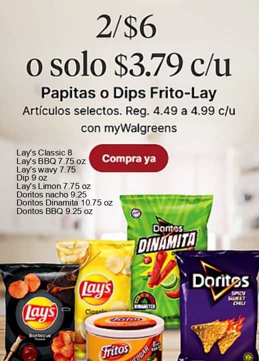 $c/u papitas dips frito-lay artÃculos selectos reg. mywalgreens lay's classic compra wavy limon doritos nacho dinamita lays classin spicy sweet chili borbecue fritos todar