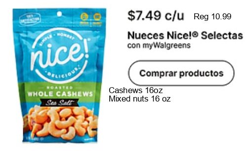 nice deliciour noasted whole cashews salt $c/u nueces nice! selectas mywalgreens comprar productos mixed nuts