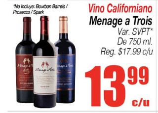 Vino Californiano menage a trois var. SVPT* de 750 ml.