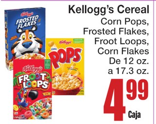 Kellogg´s cereal corn pops, frosted flakes, froot loops, corn flakes de 12 oz. a 17.3 oz.