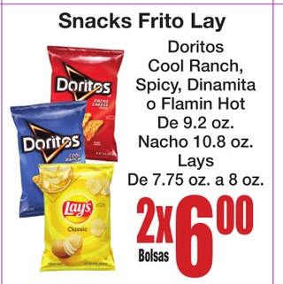Snacks Frito Lay Doritos Cool Ranch, Spicy, Dinamita o Flamin Hot De 9.2 oz. Nacho 10.8 oz. Lays De 7.75 oz. a 8 oz.