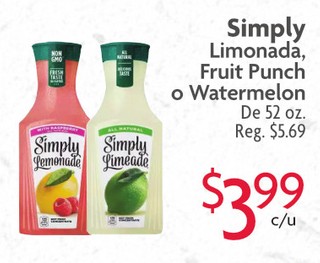 Simply Limonada, Fruit Punch o Watermelon De 52 oz.
