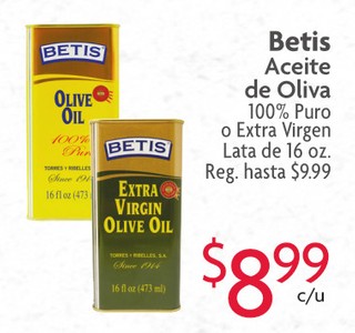 Betis Aceite de Oliva 100% Puro o Extra Virgen Lata de 16 oz.