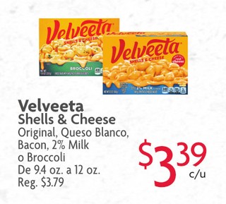 Velveeta Shells & Cheese Original, Queso Blanco, Bacon, 2% Milk o Broccoli De 9.4 oz. a 12 oz.
