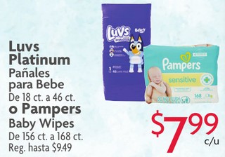 Luvs Platinum Pañales para Bebe De 18 ct. a 46 ct. o pampers Baby Wipes De 156 ct. a 168 oz.