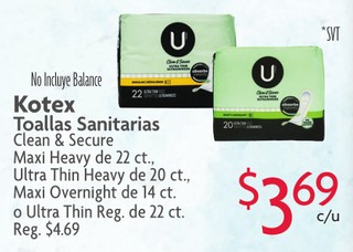 Kotex Toallas Sanitarias Clean & Secure Maxi Heavy de 22 ct., Ultra Thin Heavy de 20 ct., Maxi Overnight de 14 ct. o Ultra Thin Reg. de 22 ct.