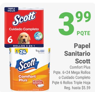 Papel Sanitario Scott Comfort Plus Pqte. 6-24 Mega Rollos o Cuidado Completo Pqte 6 Rollos Triple Hoja.