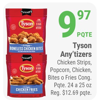 Tyson Any'tizers Chicken Strips, Popcorn, Chicken, Bites o Fries Cong. Pqte. 24 a 25 oz.