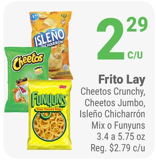 Frito Lay Cheetos Crunchy, Cheetos Jumbo, Isleño Chicharrón Mix o Funyuns 3.4 a 5.75 oz
