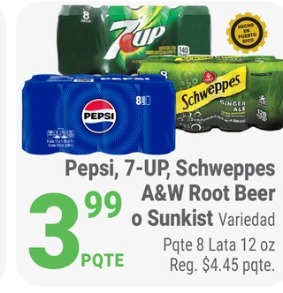 Pepsi, 7-up, schweppes ayw root beer o sunkist variedad pqte 8 lata 12 oz