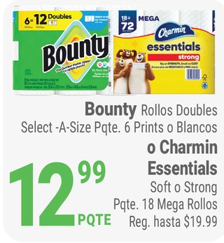 Bounty Rollos Doubles Select-A-Size Pqte. 6 Prints o Blancos o Charmin Essentials Soft o Strong Pqte. 18 Mega Rollos